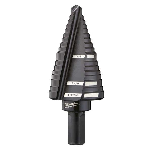 Step Drill Bit, High Speed Steel, Black Oxide, 7/8 in to 1 7/32 in Size Range, Straight with Three Flats, 3/8 in Shank Diameter, 3 in Overall Length