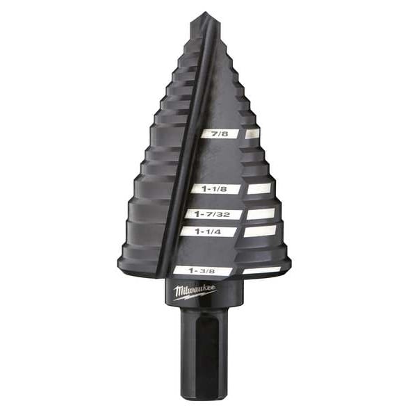 Step Drill Bits with JAM-FREE Performance feature a dual-flute design delivering up to 2X faster hole times, up to 4X longer life and up to 50% more holes per battery charge than competitors. Ideal for drilling small and large-diameter holes in steel and plastic, these bits are Optimized for Cordless Drills in High Speed. The Rapid Strike tip allows for a fast and accurate start that generates less heat, resulting in longer bit tip life. Black oxide coating also enhances durability, hole quality and bit life.For user convenience and accuracy, each bit has laser-engraved reference marks you can see while drilling. The 3-flat Secure-Grip shank ensures a solid connection with the drill chuck. The #12 Step Drill Bit has 5 hole sizes in 1/8" increments ranging from 7/8" to 1-3/8". Jam-Free Performance in high speed with most professional 18 volt cordless drills with lithium-ion battery technology.