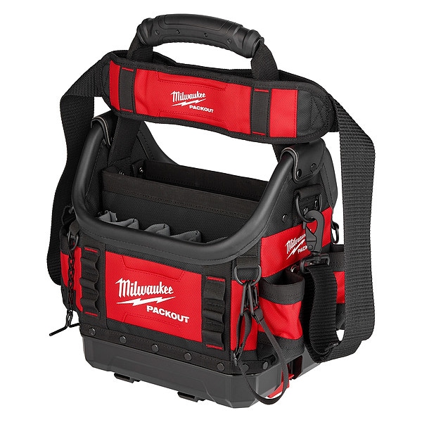 Tool Tote, Bag Style Tote, Material Polyester, Closure Type Zipper, Number of Bags 1, Overall Height 19 in, Overall Depth 13 in, Overall Width 9 3/4 in, Overall Diameter Not Applicable, Reinforced Bottom Reinforced Bottom Included, Color Black, Red, Shape Rectangle, Compatible Modular System PACKOUT(TM), Features All Metal Hardware, Impact-Resistant, Stamped Metal Tape Clip, Padded Shoulder Strap, Includes Removable Shoulder Strap, Includes Laptop Pocket Laptop Pocket Not Included