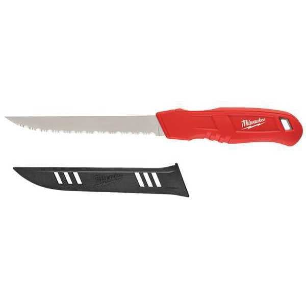 The Milwaukee Smooth Blade Insulation Knife is designed for optimal edge retention and durability. The stainless steel blade is engineered to stay sharper longer when cutting mechanical and HVAC insulation. A full metal tang provides durability for tough cuts and the rounded handle allows for smoothing tapes and adhesive laps. Includes a durable blade cover for storage.
