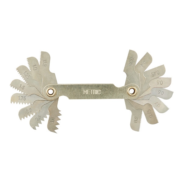 Thread Pitch Gauge, Included Thread Pitch - mm 0.35 to 3 mm, Included Threads per Inch Not Applicable, Maximum Thread Pitch - mm 3 mm, Maximum TPI Not Applicable, Minimum Thread Pitch - mm 0.35 mm, Minimum TPI Not Applicable, Number of Leaves 16, Thread Angle Not Applicable, Thread Type Metric, Gauge Material Metal