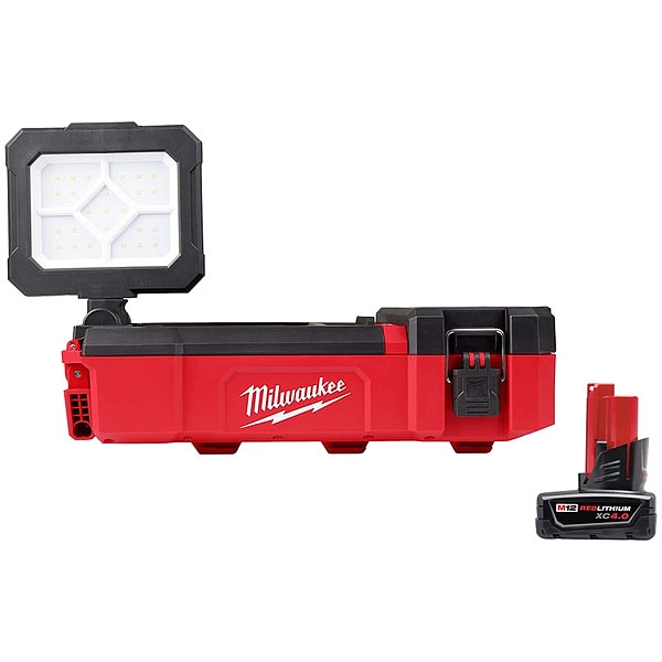 Work Light Kit, Battery Platform M12(TM), Brightness Level 1,400 lm, Maximum Brightness Level 1,400 lm, Minimum Brightness Level 350 lm, Mount Type Flat, Maximum Height 4 5/8 in, Light Distribution 100 Degrees , Head Type Rotating, Maximum Head Rotation Angle 300 Degrees , Battery Capacity (1) 4.0 Ah, Run Time 12 hr, Voltage 12V DC, Charging Capability USB Charging, Compatible Battery Capacity 4.0 Ah, Features Low-Profile Internal Storage, Pivoting Battery Housing, USB-A and USB-C Ports