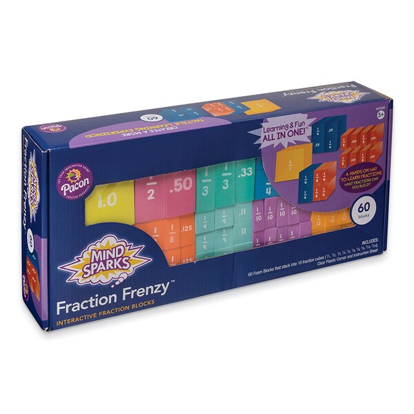 Break apart the blocks and quickly learn how to build up fractions to equal a whole. Fraction FrenzyTM is an engaging introduction to spatial relations. Makes solving division equations with fractions easy. Includes 60 blocks that stack into 10 fraction cubes (1/1, 1/2, 1/3, 1/4, 1/5, 1/6, 1/8, 1/9, 1/10, 1/12) and a box for storage and travel. Designed for children ages 5 and up.