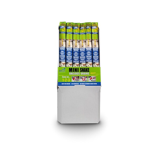 Mini Snake Drain Opener Unclogs Drains No Need To Remove Drain Covers Safe Easy To Use No Chemicals Made Of High Strength Resin. Extra long length to get into the p trap to unclog hair. Barbed end to grab hair and top loop and handle to help wind hair in clog and ease of pulling clog out of the pipe. Self Selling floor display.