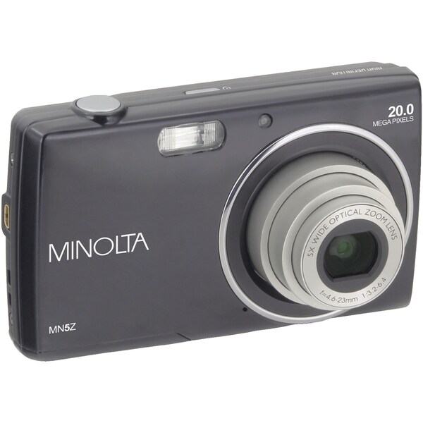 The Minolta 20-Megapixel MN5Z HD Digital Camera with 5x Zoom is a compact, point-and-shoot digital camera featuring a 20-megapixel high-sensitivity CCD sensor to produce high-resolution still images and HD 720p videos. The built-in 5x optical zoom lens provides a focal length range of 26mm-130mm, covering wide-angle to telephoto lengths. A built-in 2.7-in. LCD, face detection, smile/blink shutter and 31 settings of scene modes make shooting the perfect shot easy in any environment.