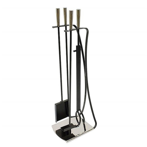 In sleek all black, or with the bold contrast of Polished Brass or Nickel against matte, the crisp lines and graceful curved design of the Park Avenue Tool Set are a step away from tradition into contemporary d?cor. These toolsets are modern in design, with solid comfortable handles, and feature four conventional fire-tending tools- tongs, poker, hoe and shovel.