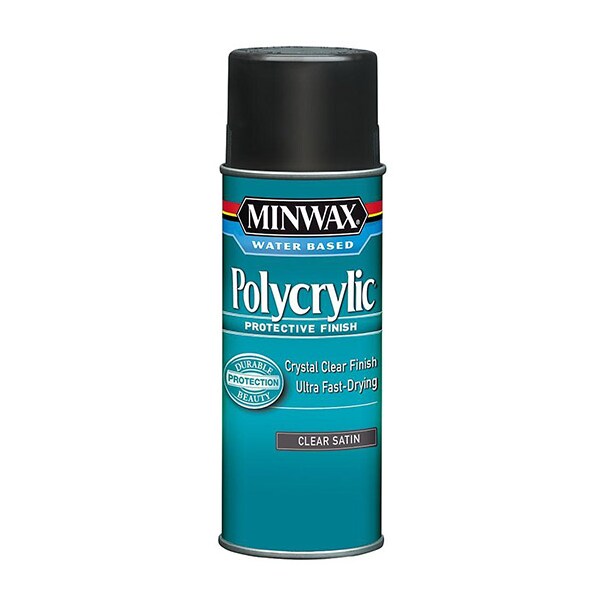 A hard crystal clear, ultra fast-drying protective finish. It has very little odor and cleans up with water. Its great clarity makes it perfect for use over light woods, pastel-stained woods and painted surfaces. Polycrylic 33333 Water Based Protective Finish, 11.5 oz Aerosol Can, Clear, Satin, 125 sq-ft/qt Coverage