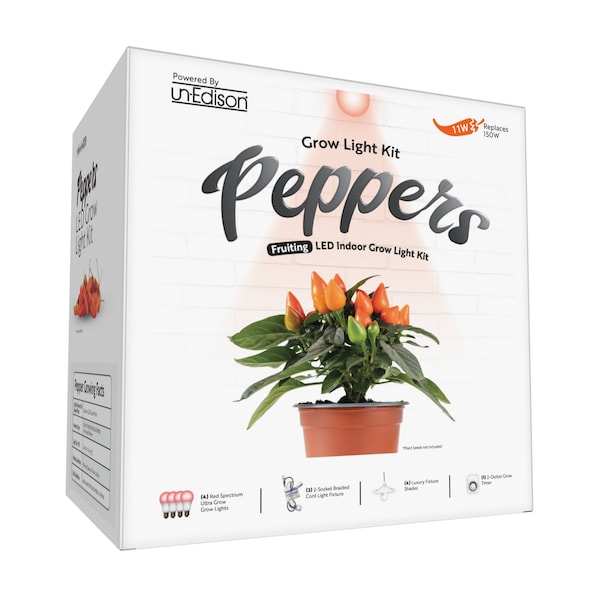 Grow Peppers all year long when choosing the Unedison Designer Pepper Grow Light Kit! This kit includes flexible braided cord light fixture, grow light bulbs and a timer to automate the growth cycle. This Designer kit comes with luxurious White shades designed to match appliances in your home making plant growing easy AND pretty. Braided cord and white socket holders blend in to your home's interior. Peppers require 6-8 hours of DIRECT sunlight per day; when days are short or clouds are heavy, turn on the grow light so plants don't miss out! Plants grown strictly under artificial light need up to 18 hours of light to grow efficiently. Make sure plant is properly watered and uses drainable soil for best growth results. Chemical-free indoor growing is perfect for many different environments, such as small kitchen herb gardens, apartments with limited sunlight, basement fruit/vegetable gardens, anywhere you want to grow! Comes with one bonus SproutMatic timer to manage your plant's lighting cycle: Set the time and push the tabs down to set how long your plants receive light. Results vary by many factors and artificial lights do not fully replace light from the sun.