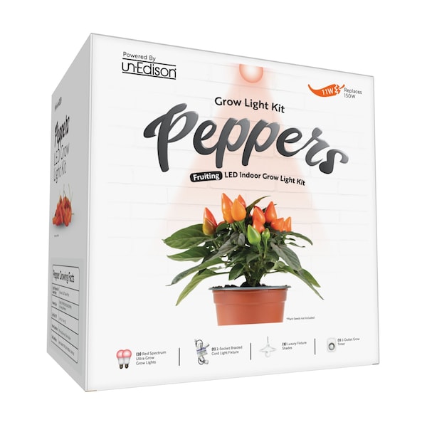 Grow Peppers all year long when choosing the Unedison Designer Pepper Grow Light Kit! This kit includes flexible braided cord light fixture, grow light bulbs and a timer to automate the growth cycle. This Designer kit comes with luxurious White shades designed to match appliances in your home making plant growing easy AND pretty. Braided cord and white socket holders blend in to your home's interior. Peppers require 6-8 hours of DIRECT sunlight per day; when days are short or clouds are heavy, turn on the grow light so plants don't miss out! Plants grown strictly under artificial light need up to 18 hours of light to grow efficiently. Make sure plant is properly watered and uses drainable soil for best growth results. Chemical-free indoor growing is perfect for many different environments, such as small kitchen herb gardens, apartments with limited sunlight, basement fruit/vegetable gardens, anywhere you want to grow! Comes with one bonus SproutMatic timer to manage your plant's lighting cycle: Set the time and push the tabs down to set how long your plants receive light. Results vary by many factors and artificial lights do not fully replace light from the sun.