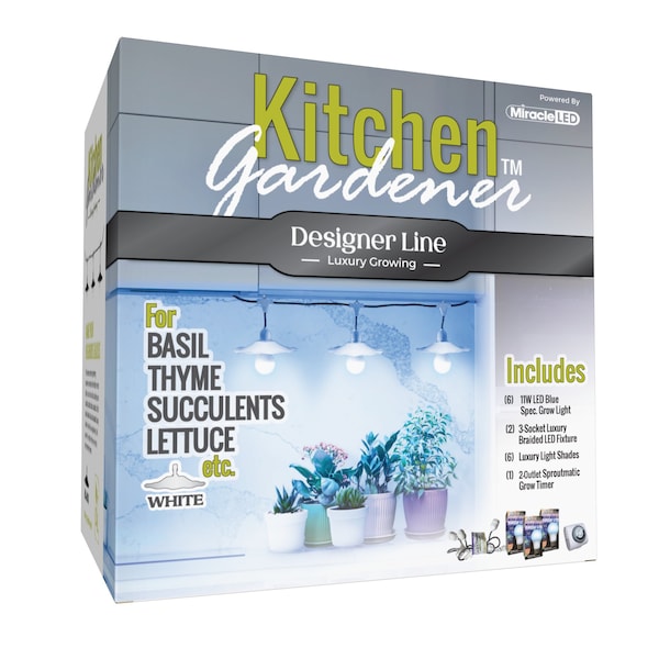 Grow your hungry plants exactly how you need to with the Miracle LED Designer Kitchen Gardener Corded Grow Light Kit. Acting like an extension cord for your LED Bulbs, never again struggle with supplying your plants with enough light or sacrifice the layout of your home in order to move your plants closer to the light they need! Designer kits come with luxurious shades designed to match appliances in your home making plant growing easy AND pretty. Braided cord and white socket holders blend in to your homes interior. Place anywhere and fasten to anything with ease, Miracle LED Grow Lights are a must have for any economical indoor gardener. Chemical-free indoor growing is perfect for many different environments, such as small kitchen herb gardens, apartments with limited sunlight, basement fruit/vegetable gardens, anywhere you want to grow! Comes with one bonus SproutMatic timer to manage your plant's lighting cycle with ease! Set the time and push the tabs down to set how long your plants receive light.