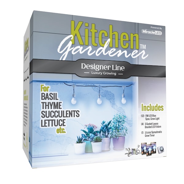 Grow your hungry plants exactly how you need to with the Miracle LED Designer Kitchen Gardener Corded Grow Light Kit. Acting like an extension cord for your LED Bulbs, never again struggle with supplying your plants with enough light or sacrifice the layout of your home in order to move your plants closer to the light they need! Braided cord and white socket holders blend in to your homes interior. Place anywhere and fasten to anything with ease, Miracle LED Grow Lights are a must have for any economical indoor gardener. Chemical-free indoor growing is perfect for many different environments, such as small kitchen herb gardens, apartments with limited sunlight, basement fruit/vegetable gardens, anywhere you want to grow! Comes with one bonus SproutMatic timer to manage your plant's lighting cycle with ease! Set the time and push the tabs down to set how long your plants receive light.