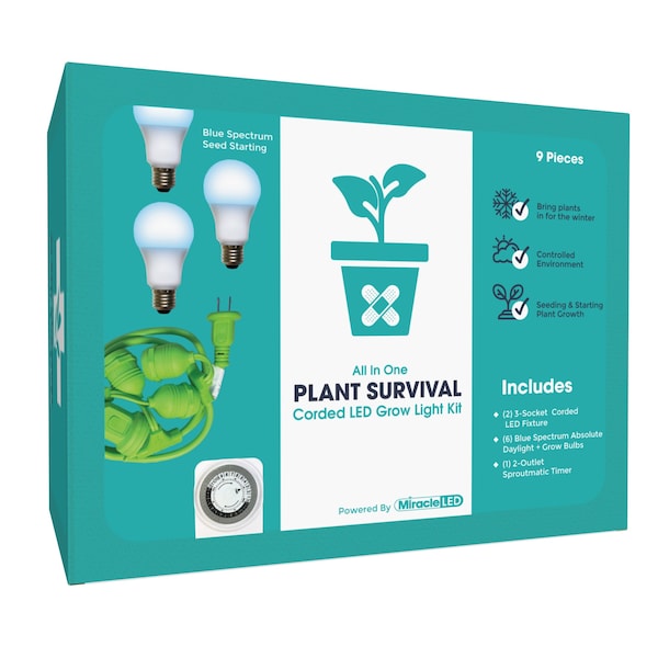 Save your sad, withering plants with the Miracle LED Plant Survival Indoor Garden Corded Grow Light Kits before it's too late! Bring your geraniums in for the winter or start growing your spring seeds indoors to save sun deprived plants during the winter months. Miracle LED grow bulbs mimic the natural daylight & spectrums of light plants need to survive. Place anywhere and fasten to anything with ease, Miracle LED Grow Lights are a must have for any economical indoor gardener. Chemical-free indoor growing is perfect for many different environments, such as small kitchen herb gardens, apartments with limited sunlight, basement fruit/vegetable gardens, anywhere you want to grow! Comes with one bonus SproutMatic timer to manage your plant's lighting cycle: Set the time and push the tabs down to set how long your plants receive light. Results vary by many factors and artificial lights do not fully replace light from the sun.