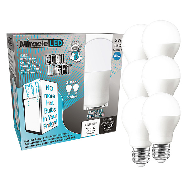 LED Bulb, A15 Bulb Shape, Medium Screw (E26) Bulb Base Type, LED, 6500K, 315 lm, Wattage Equivalency 3800W HAL, Watts 3 W, 120 V AC, Bulb Beam Angle 200 Degrees , Dimmable No, Bulb Designation 602185, Bulb Primary Application Freezers, Refrigerators, Bulb Type Standard, 1 7/8 in Bulb Dia., 3 1/2 in Overall Length, Rated Life 20,000 hr, Indoor/Outdoor Usage Indoor/Outdoor, Shatter-Resistant Yes, Package Quantity 6