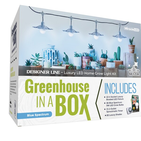 Grow your hungry plants exactly how you need to with the Miracle LED Designer Greenhouse in a Box Corded Grow Light Kit. Acting like an extension cord for your LED Bulbs, never again struggle with supplying your plants with enough light or sacrifice the layout of your home in order to move your plants closer to the light they need! This Designer kit comes with luxurious Sliver shades designed to match appliances in your home making plant growing easy AND pretty. Braided cord and white socket holders blend in to your homes interior. Place anywhere and fasten to anything with ease, Miracle LED Grow Lights are a must have for any economical indoor gardener. Chemical-free indoor growing is perfect for many different environments, such as small kitchen herb gardens, apartments with limited sunlight, basement fruit/vegetable gardens, anywhere you want to grow! Comes with one bonus SproutMatic timer to manage your plant's lighting cycle with ease! Set the time and push the tabs down to set how long your plants receive light.