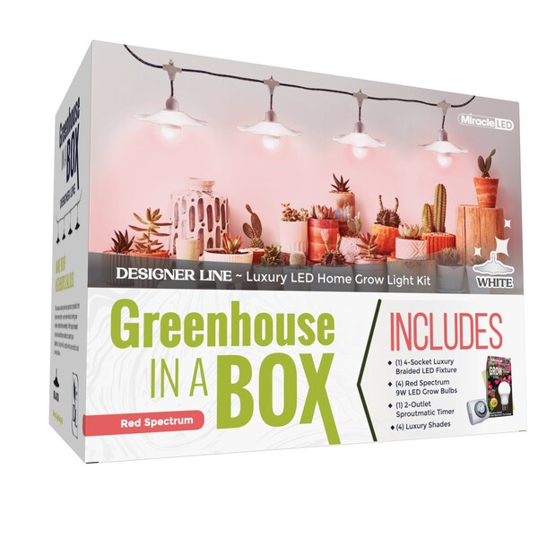 Grow your hungry plants exactly how you need to with the Miracle LED Designer Greenhouse in a Box Corded Grow Light Kit. Acting like an extension cord for your LED Bulbs, never again struggle with supplying your plants with enough light or sacrifice the layout of your home in order to move your plants closer to the light they need! This Designer kit comes with luxurious White shades designed to match appliances in your home making plant growing easy AND pretty. Braided cord and white socket holders blend in to your homes interior. Place anywhere and fasten to anything with ease, Miracle LED Grow Lights are a must have for any economical indoor gardener. Chemical-free indoor growing is perfect for many different environments, such as small kitchen herb gardens, apartments with limited sunlight, basement fruit/vegetable gardens, anywhere you want to grow! Comes with one bonus SproutMatic timer to manage your plant's lighting cycle with ease! Set the time and push the tabs down to set how long your plants receive light.