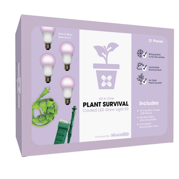 Save your sad, withering plants with the Miracle LED Plant Survival Indoor Garden Corded Grow Light Kits before it's too late! Bring your geraniums in for the winter or start growing your spring seeds indoors to save sun deprived plants during the winter months. Miracle LED grow bulbs mimic the natural daylight & spectrums of light plants need to survive. Place anywhere and fasten to anything with ease, Miracle LED Grow Lights are a must have for any economical indoor gardener. Chemical-free indoor growing is perfect for many different environments, such as small kitchen herb gardens, apartments with limited sunlight, basement fruit/vegetable gardens, anywhere you want to grow! Comes with one bonus SproutMatic timer to manage your plant's lighting cycle: Set the time and push the tabs down to set how long your plants receive light. Results vary by many factors and artificial lights do not fully replace light from the sun.