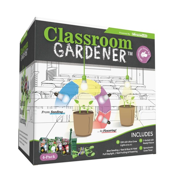 Learn the importance of horticulture at a young age with the Miracle LED Classroom Gardener Grow Light Kit! Bring growing directly into your classroom with this versatile kit for all age levels. Safe and easy to use, the Classroom Gardener contains bulbs with unique spectrums of light to hit the Seeding, Growth and Fruiting & Flowering stages of plant life. Our bright LED Grow Bulbs replace old incandescent grow lights and emit virtually no heat while saving hundreds in energy per year. Versatile and practical, this kit is all you need to start your classroom garden in one neat package. Place anywhere and fasten to anything with ease! Our Sproutmatic All Weather Controls Timer helps time the growing process to perfection. Simply set the time and push the tabs down to set how long your plants receive light each day.