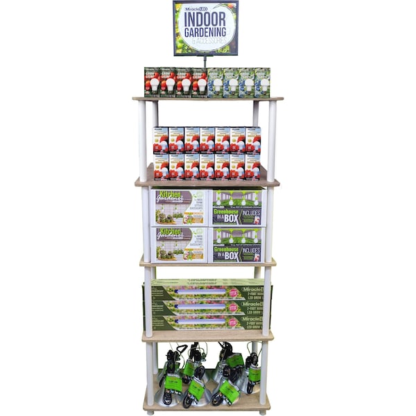 Red LED Grow Bulbs (25), Blue LED Grow Bulbs (25), Full Spectrum LED Grow Bulbs (75), Kitchen Gardener Kits (6), Greenhouse in a Box Kits (6), 2ft 25W Hangable LED Grow Lights (6), Clamp Fixtures (24), 5 Tier Shelf Display (1), Laminated Intro to Grow Lights POP sheets w/ziptie for hanging on shelving (1 Set), Indoor Gardening & Accesories Header Sign w/Frame Stand (1)