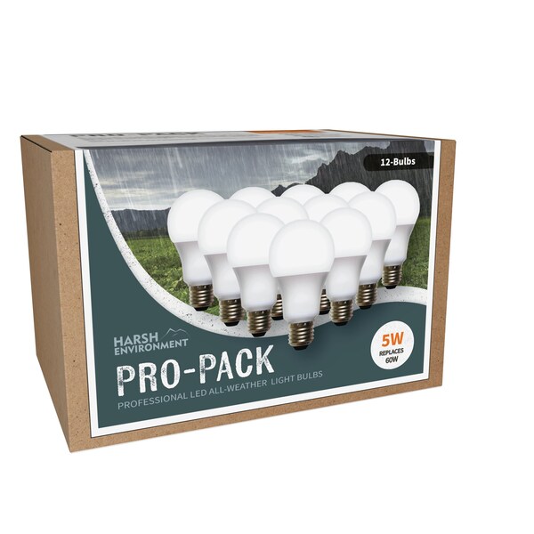 LED Harsh Environment Pro-Pack 5W Replaces 60W, Shatter Resistant All Weather Lightbulb, 12PK