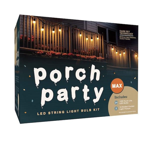 Includes 24 LED bulbs, 2 string fixtures. Fill your outdoor living spaces with an environmentally friendly bonfire glow with our Miracle LED Porch Lite. Screwing into any standard fixture, these energy efficient LEDs are a must have for any outdoor lighting scenario and shine over 3X brighter than competing outdoor lighting systems. These 14W LEDs replace 150W Old Incandescent Bulbs and run at a FRACTION of the cost at only $1.68 per year on your energy bill! While giving a relaxing light to your outdoor space, the amber color technology in these LED bulbs reduces harsh blue light pollution that has been known to confuse animals at night. This soothing amber glow sits comfortably outside the visible light spectrum of most flying insects, keeping unwanted guests from swarming your space. FOR TEMPORARY USE ONLY, this Kit is not designed to be a prolonged or permanent outdoor fixture.