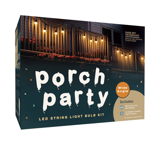 Includes 48 LED bulbs, 4 string fixtures. Fill your outdoor living spaces with an environmentally friendly bonfire glow with our Miracle LED Porch Lite. Screwing into any standard fixture, these energy efficient LEDs are a must have for any outdoor lighting scenario and shine over 3X brighter than competing outdoor lighting systems. These 9W LEDs replace 100W Old Incandescent Bulbs and run at a FRACTION of the cost at only $1.08 per year on your energy bill! While giving a relaxing light to your outdoor space, the amber color technology in these LED bulbs reduces harsh blue light pollution that has been known to confuse animals at night. This soothing amber glow sits comfortably outside the visible light spectrum of most flying insects, keeping unwanted guests from swarming your space. FOR TEMPORARY USE ONLY, this Kit is not designed to be a prolonged or permanent outdoor fixture.