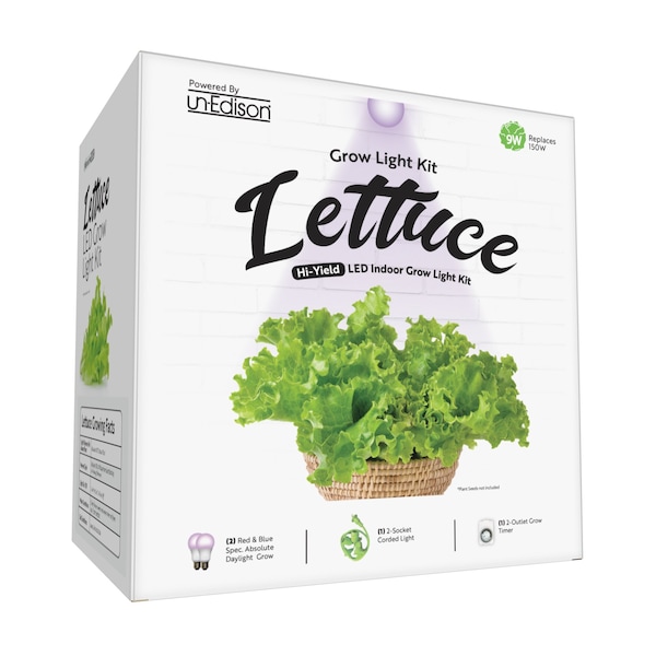 Grow lettuce all year long when choosing the Unedison Lettuce Grow Light Kit! This kit includes flexible rubber corded light fixture, grow light bulbs and a timer to autmate the growth cycle. Lettuce plants require 6-8 hours of DIRECT sunlight per day; when days are short or clouds are heavy, turn on the grow light so plants don't miss out! Plants grown strictly under artificial light need up to 16 hours of light to grow efficiently. Make sure plant is properly watered and uses drainable soil for best growth results. Chemical-free indoor growing is perfect for many different environments, such as small kitchen herb gardens, apartments with limited sunlight, basement fruit/vegetable gardens, anywhere you want to grow! Comes with one bonus SproutMatic timer to manage your plant's lighting cycle: Set the time and push the tabs down to set how long your plants receive light. Results vary by many factors and artificial lights do not fully replace light from the sun. SEEDS NOT INCLUDED!