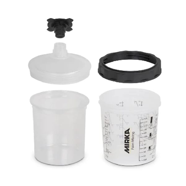 Mirkas Paint cup system is a complete system, ready to attach to the spray gun (spray gun adapter sold separately). The set includes 50 liners and lids with a 125um filter, 20 stoppers, one outer hard cup and one collar. All parts are corrosion-resistant to both paint and thinner.