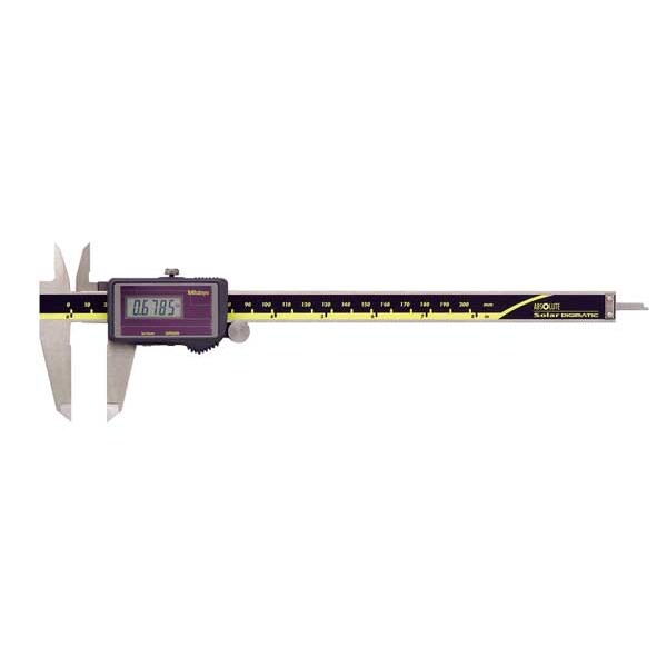 Solar-Powered Digital Calipers, Caliper Range 0-8 in /0-200mm, Resolution 0.0005 in/0.01 mm, IP Rating Not Rated, SPC Output No, Accuracy +/-0.001 in, Caliper Material Stainless Steel, Absolute Positioning Yes, Jaw Depth 1 31/32 in, Long Form Calibration Certificate No, Features Rolling Thumb Wheel, Origin, Inch/mm, Absolute Scales, Standards TUV Rheinland