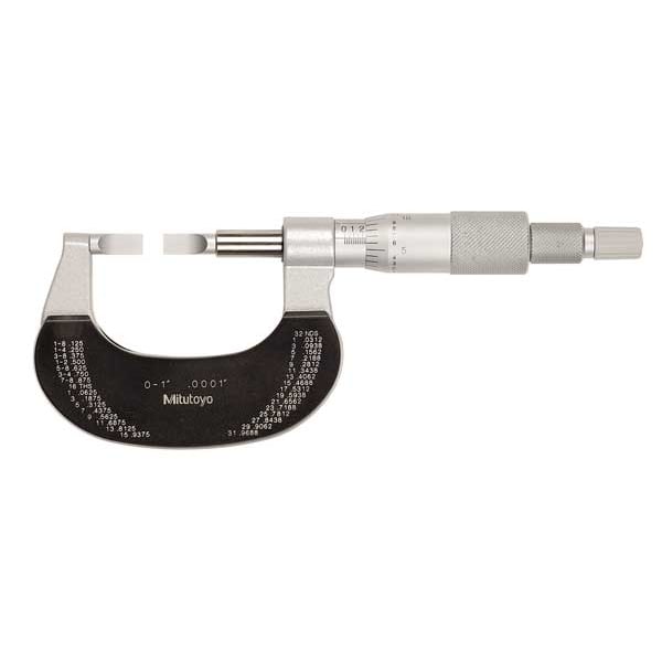 Digital Blade Micrometer, Range 0 in to 1 in, Resolution 0.0001 in, Accuracy +/-0.00015 in, IP Rating IP54, SPC Output No, Long Form Calibration Certificate No, Anvil Shape Blade, Anvil Size 0.030 in x 0.256 in, Dimension Type Inch, Operation Type Mechanical, Thimble Type Ratchet, Anvil Material Steel, Case Included Yes, Case Type Plastic, Features Enamel Finish, Included Certification Certificate of Inspection, Includes Key Spanner, Fitted Carrying Case, Lock Nut Type Lever