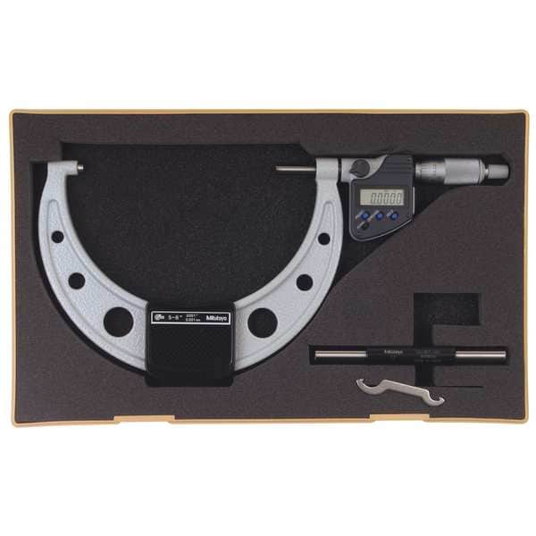 IP65 Digital Outside Micrometer, Range 127 to 152 mm, 5 in to 6 in, Resolution 0.00005 in/0.001 mm, Accuracy +/- 0.0001 in, IP Rating IP65, SPC Output Yes, Data Output Type Not Applicable, Coolant Resistant Yes, Dimension Type Inch/Metric, Jaw Depth Not Applicable, Operation Type Digital, Thimble Type Ratchet, Anvil Material Carbide, Anvil Shape Flat, Battery Size SR44, Case Included Yes, Case Type Plastic Case, Compatible Data Output Cable Mfr. No. 05CZA662, Mfr. No.05CZA663, Display Type LCD