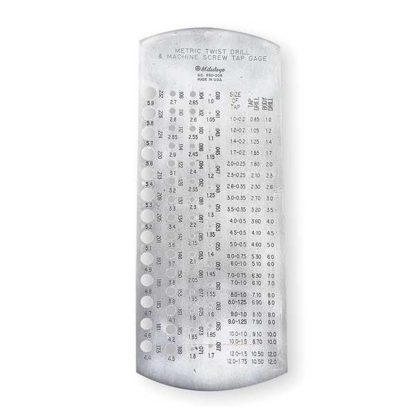 Drill Bit Gauge, Material Steel, Finish Satin Chrome, Dimension Type Metric, For Use With Metric Drill Bits, Maximum Size - Inch 0.2323 in, Maximum Size - Wire A, Minimum Size - Inch 0.03937 in, Minimum Size - Wire 1.0 mm, Number of Holes 57, Length 6 3/8 in, Range 1 to 5.9 mm, Thickness 5/64 in, Width 2 1/2 in