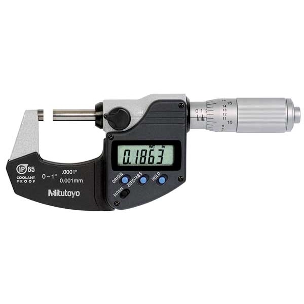 IP65 Digital Outside Micrometer, Range 0 in to 1 in, 0 to 25 mm, Resolution 0.00005 in/0.001 mm, Accuracy +/- 0.00005 in, IP Rating IP65, SPC Output Yes, Data Output Type Not Applicable, Long Form Calibration Certificate No, Coolant Resistant Yes, Dimension Type Inch/Metric, Included Certification Certificate of Inspection, Jaw Depth Not Applicable, Operation Type Digital, Thimble Type Ratchet, Anvil Material Carbide, Anvil Shape Flat, Case Included Yes, Case Type Plastic Case, Display Type LCD