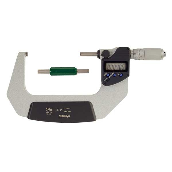 IP65 Digital Outside Micrometer, Range 3 in to 4 in, 76.2 to 101.6 mm, Resolution 0.00005 in/0.001 mm, Accuracy +/- 0.00005 in, IP Rating IP65, SPC Output Yes, Data Output Type Not Applicable, Long Form Calibration Certificate Yes, Coolant Resistant Yes, Dimension Type Inch/Metric, Jaw Depth Not Applicable, Operation Type Digital, Thimble Type Ratchet, Anvil Material Carbide, Anvil Shape Flat, Battery Size SR44, Case Included Yes, Case Type Plastic, Display Type LCD, Frame Material Iron