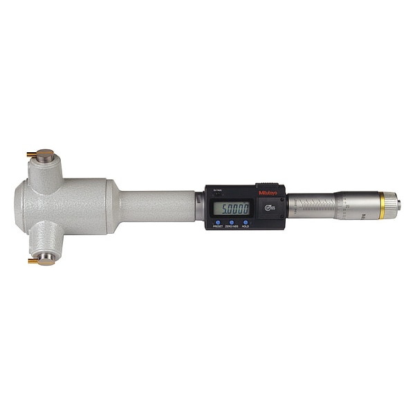 Digital 3-Point Inside Micrometer, Range 101.6 mm to 127 mm, 4 in to 5 in, Resolution 0.00005 in, 0.001 mm, IP Rating IP65, SPC Output Yes, Data Output Type Cabled, Coolant Resistant No, Inside Micrometer Type 3-Point Inside Micrometer, Number of Micrometers 1, Operation Type Digital, Thimble Type Ratchet, Battery Size SR44, Case Included Yes, Case Type Wood Case, Compatible Data Output Cable Mfr. No. 05CZA662, Mfr. No.05CZA663, Contact Point Material TiN Coated Steel, Contact Point Shape Flat