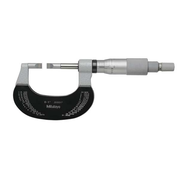 Mechanical Blade Micrometer, Range 0 in to 1 in, Resolution 0.0001 in, Accuracy +/-0.00015 in, IP Rating Not Rated, SPC Output No, Long Form Calibration Certificate No, Anvil Shape Blade, Dimension Type Inch, Jaw Depth Not Applicable, Operation Type Mechanical, Thimble Type Ratchet, Anvil Material Carbide Tipped, Case Included Yes, Features Keyways, Measuring the Groove Diameter of Shafts, Included Certification Not Included, Includes Box, Key, Setting Standard (From 25 mm Upward)