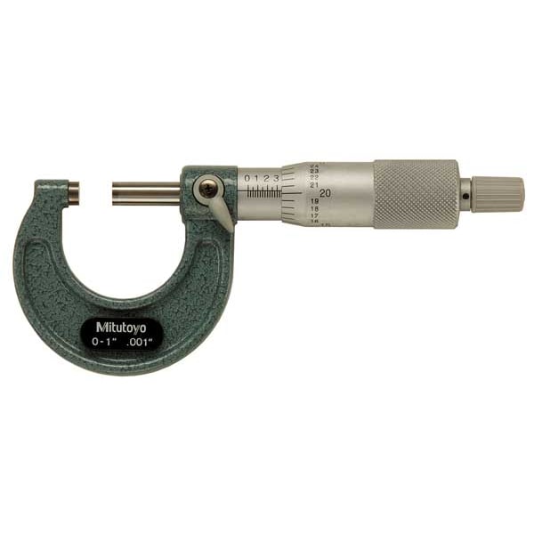 Mechanical Outside Micrometer, Range 0 in to 1 in, Resolution 0.001 in, Accuracy +/-0.0001 in, Long Form Calibration Certificate No, Dimension Type Inch, Included Certification Certificate of Inspection, Jaw Depth Not Applicable, Mechanical Display Type Vernier, Operation Type Mechanical, Resolution - Counter Not Applicable, Thimble Type Ratchet, Anvil Material Carbide Tipped, Anvil Shape Flat, Case Included Yes, Case Type Plastic Case, Frame Material Iron, Includes Key Spanner, Lock Nut Type -