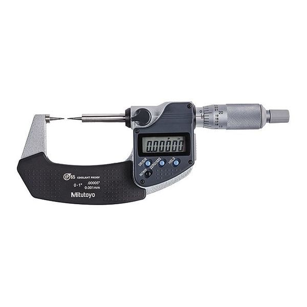 If you need a micrometer that is accurate and precise, the Mitutoyo 342-351-30 Point Micrometer will meet your needs. It has a ratchet thimble for added convenience. The digital point offers a 0.00005"/0.001mm resolution and an accuracy of +/-0.0001 in./+/-0.25mm over the full range of measurement, which is from 0 to 1"/0 to 25.4mm respectively. This point micrometer has a non-slip grip finish and IP65 water/dust protection so it can be used in all types of conditions without being damaged or malfunctioning as a result of exposure to liquids or dirt particles. If you are looking for a high quality point micrometer, this one from Mitutoyo will not disappoint you.