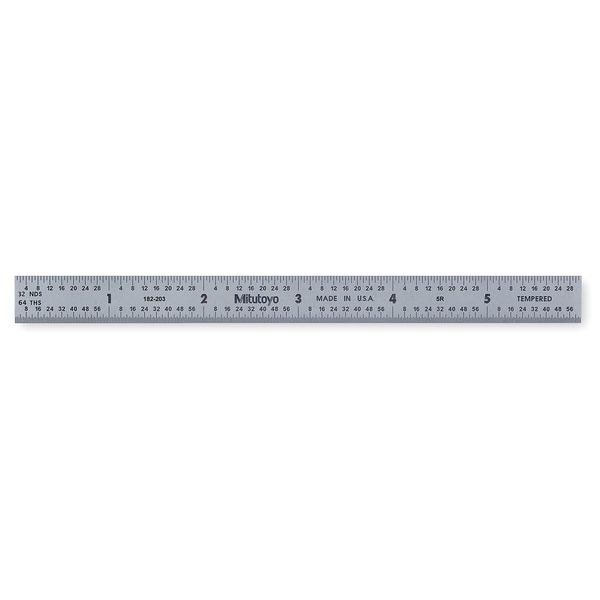 The Mitutoyo 182-203 Steel Rule, Flexible is a flexible ruler that offers exceptional accuracy. This steel rule has a 32nds and 64ths front graduation and 10ths and 100ths back graduation. The black nonglare satin chrome finish makes it easy to read the graduations from both sides of the ruler. Made of tempered stainless steel, this 6 in. flexible rule is very durable. It also has a 1/2 in. width for increased strength and rigidity when measuring large objects. If you need a high quality tool to help with your measuring needs, then the Mitutoyo 182-203 Steel Rule, Flexible is perfect for you.