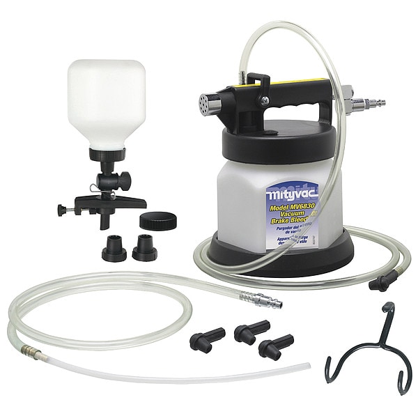 Brake Bleed Kit, Product Type Brake Bleed Kit, Fluid Type Brake Fluid, Hose Length 4 ft, 6 ft, Reservoir Capacity 1.9 qt, Overall Length 11 1/2 in, Overall Depth 8 13/16 in, Overall Width 11 1/2 in, Overall Diameter 9 in, Overall Height 10 13/16 in, Power Source Pneumatic, Capabilities Brake Bleeding, Color White, Features Automatic Overflow Prevention, Compressed Air Operation, Quick-Disconnect Coupler for Accessories, Quiet Muffled Exhaust, Variable Control Thumb Throttle
