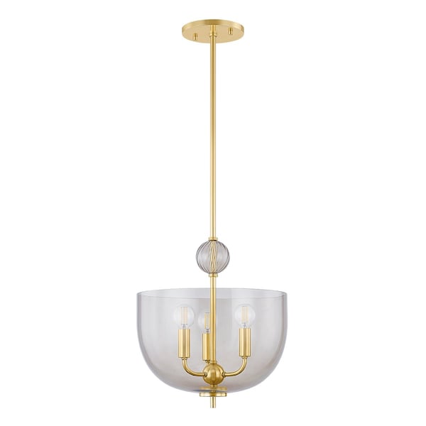 Mixed glass, circular forms, and an upturned dome silhouette define the 1920s-inspired Arianne. Decorative ribbed glass and metal baubles add to the playful nature of this pendant. The plated bronze glass and Aged Brass frame work together to produce a warm, golden diffusion of light.
