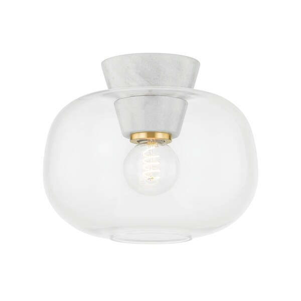 A marriage of opposing materials, this sculptural flush mount features a honed Thasos marble canopy, which creates the illusion of piercing through a soft glass shade. The bubble-like nature of the clear glass swells around the light source. Accessible, yet with a designer feel, Ariella floats overhead in contemporary bathrooms, bedrooms, and kitchens.
