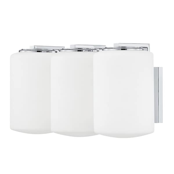With shades large enough to nearly hide the backplate, these bath and vanity fixtures appear to hang in midair. Bulbs enclosed inside the opal matte cylindrical shades give off a soft glow. Polished chrome accents at the shade top, arm and backplate give the fixture a clean look.
