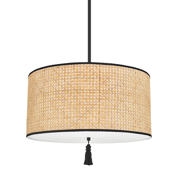 A bohemian darling, Dolores is brimming with theatrical flair. Dolores pays homage to the cane mania of the 70s, reinvented for today. Natural cane is woven intricately around a white cotton shade, contrasted with a soft black finish. The flush mount and pendant versions feature a decorative tassel for good measure.