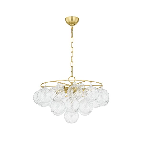 Swirl-ribbed or plated champagne glass globes dangle from an Aged Brass frame, creating this cloud-like showstopper. Whether you're dressing up a breakfast nook with the small chandelier, adding a soft glow to an entryway with the flush mount, or making a glam statement in your dining room with the large chandelier, the possibilities for Mimi are endless. Part of our Megan Molten x Mitzi Tastemakers collection.