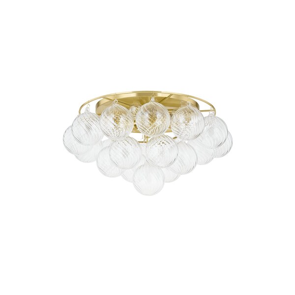 Swirl-ribbed or plated champagne glass globes dangle from an Aged Brass frame, creating this cloud-like showstopper. Whether you're dressing up a breakfast nook with the small chandelier, adding a soft glow to an entryway with the flush mount, or making a glam statement in your dining room with the large chandelier, the possibilities for Mimi are endless. Part of our Megan Molten x Mitzi Tastemakers collection.