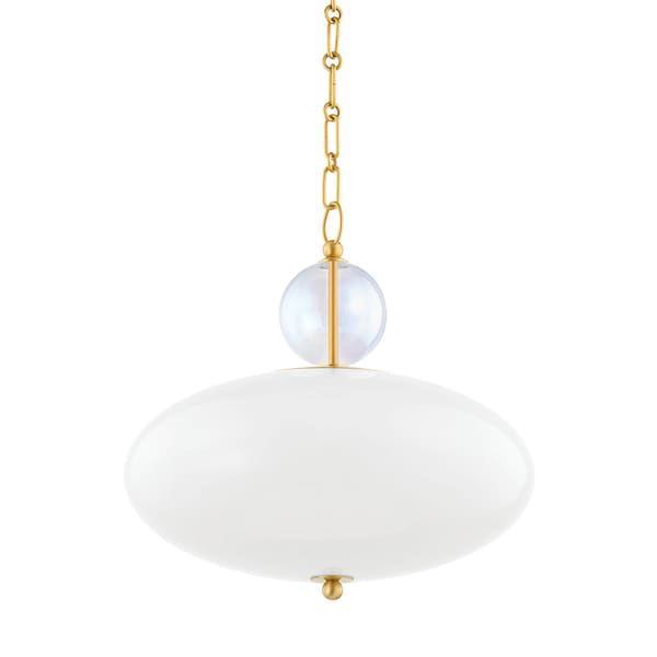 Iridescence has seen a resurgence in fashion and beauty so it's no surprise that design is the next frontier. This delicate, totem-style pendant is suspended from an aged brass chain, featuring an iridescent globe accent and opal glass shade. Full of vintage appeal, the Viviana Pendant brings old world charm to the everyday.