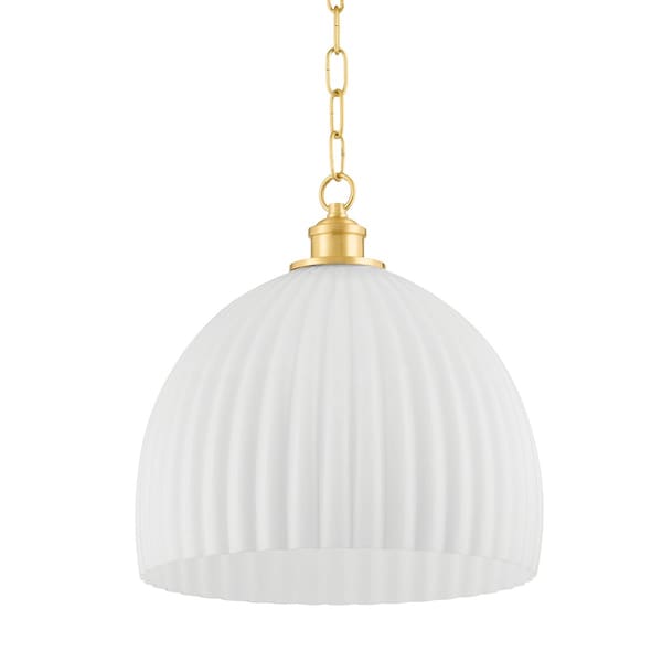 Hillary captures the cottage charm captivating the design world. The single light pendant, available in aged brass and old bronze features a fluted glass shade dangling elegantly from the chain. Stunning on its own, this antique darling proves better in pairs, layered in multiples over a kitchen island or dining scene. Also available in a smaller size.