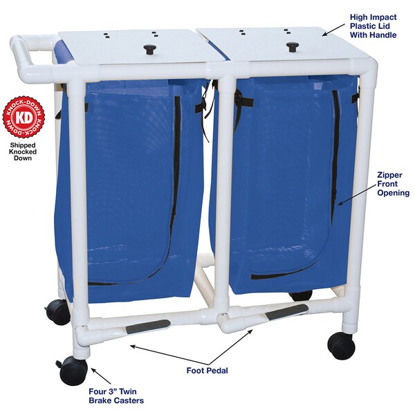 Double Hamper With Mesh Bag (14.46 Gallon Capacity Per Bag), 3" Twin Casters, Zipper Opening, Push/Pull Handle & Footpedal