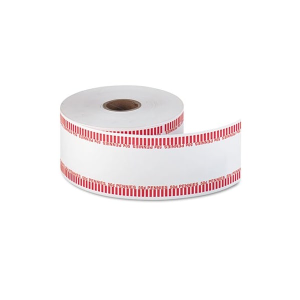 1,000 feet of continuous, color-coded flat coin wrappers. Approximately 1,900 wrappers per roll. For use in automatic coin wrapping machines. Wrapper Type: Continuous Roll; Denomination: Pennies; Coin Quantity: 50; Total Dollar Value: $0.50.