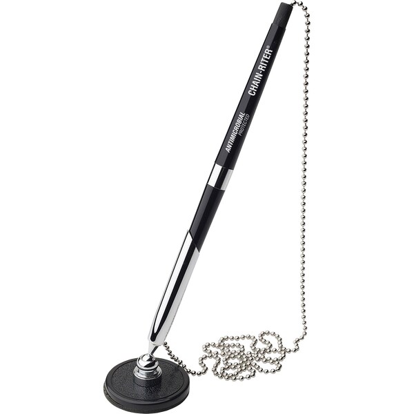Security pen features a round adhesive-backed base, an ergonomic, tapered barrel for comfortable writing, and antimicrobial protection. Antimicrobial protection originating from a naturally occurring silver technology prevents bacterial and fungal growth on the surface of the pen. This long-lasting protection evolves from an environmentally friendly technology and is EPA and FDA approved. Barrel design features a metal tip to prevent cracking and a metal band in center for easy disassembly during refills. Swivel socket and pen holder are made of chrome-plated metal for the look and feel of expensive pen sets and the strength to withstand daily abuse. Hard rubber base won't crack or break and is backed with double-coated adhesive to provide a strong bond to counters. Ball chain extends to length of 26" for maximum desk coverage. Ballpoint pen offers a fine point. Chain-Riter Counter Pen uses standard ballpoint refills.